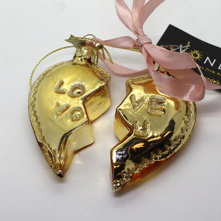De kerstbal liefde hartenset is een prachtig symbool van samen zijn, ook als je even niet bij elkaar bent. Deze bijzondere set bestaat uit twee handgemaakte ornamenten in de vorm van een goudkleurig gebroken hart met de tekst “I Love You”. De twee helften passen perfect in elkaar en staan voor liefde, vriendschap en verbondenheid.